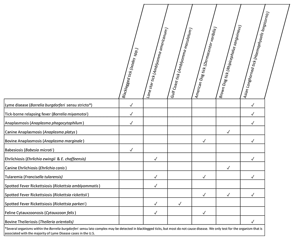 Ticks can transmit germs (i.e., pathogens) to people, pets, or livestock. Since we care about the health of your WHOLE family, we include germs that cause disease in humans and animals in our standard panels for one flat rate of $49.99 per tick. We will identify which species of tick(s) you have submitted and then run the panel(s) for the most common disease-causing germs that species is known to transmit. See a list of our panels below.
